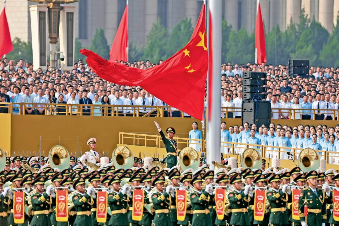 9月3日,纪念中国人民抗日战争暨世界反法西斯战争胜利80周年大会在北京隆重举行。这是天安门广场举行隆重的升国旗仪式。 (新华社记者 张晨/摄)