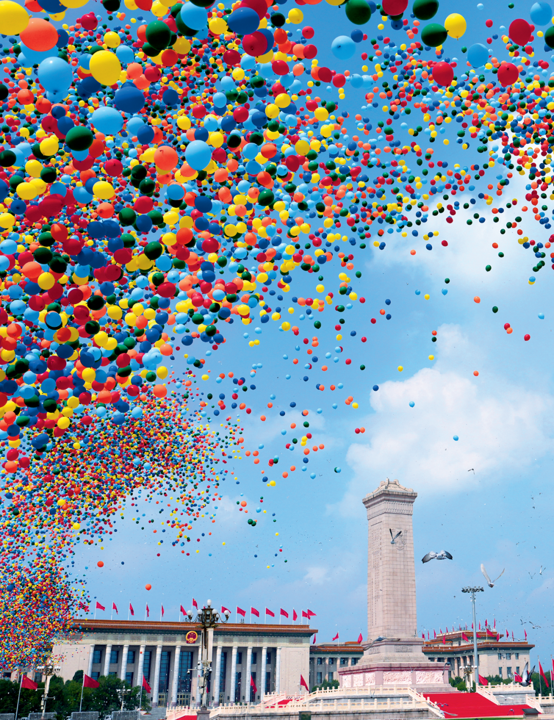 9月3日,纪念中国人民抗日战争暨世界反法西斯战争胜利80周年大会在北京隆重举行。这是纪念大会现场放飞气球和鸽子。 (新华社记者 牟宇/摄)